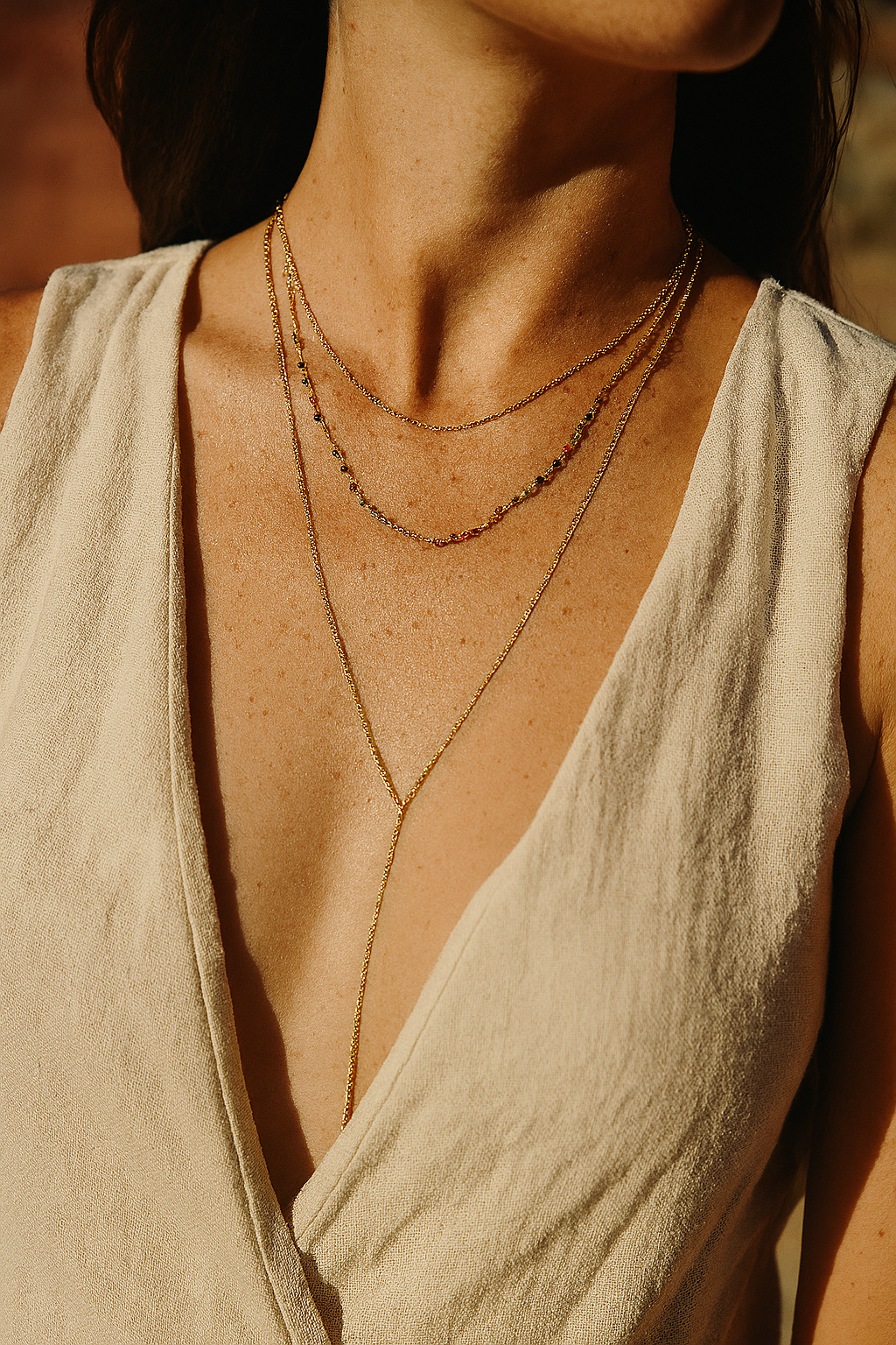 Fineline je lančić koji ti daje onaj effortless boho touch – dva sloja, jedan zlatni, jedan s nježnim perlicama u boji. Ovaj komad unosi život u svaki outfit, bilo da ga nosiš preko T-shirta, lanene košulje ili badića. Osjećaj kao da si na ljetnom festivalu… svaki dan.