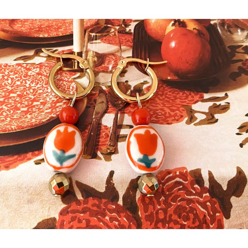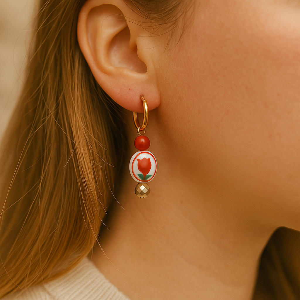 keramičke naušnice, ručno rađene naušnice, naušnice s tulipanom, chic nakit, crvene naušnice, naušnice s koraljem, handmade earrings, Dutch design jewelry, naušnice za poklon, ZAYA nakit, lagane naušnice, indie nakit Europa, modni dodaci s karakterom, simbolične naušnice, slow fashion nakit, Chic Le Freak, nakit s detaljima, zlatne naušnice, naušnice s porukom
