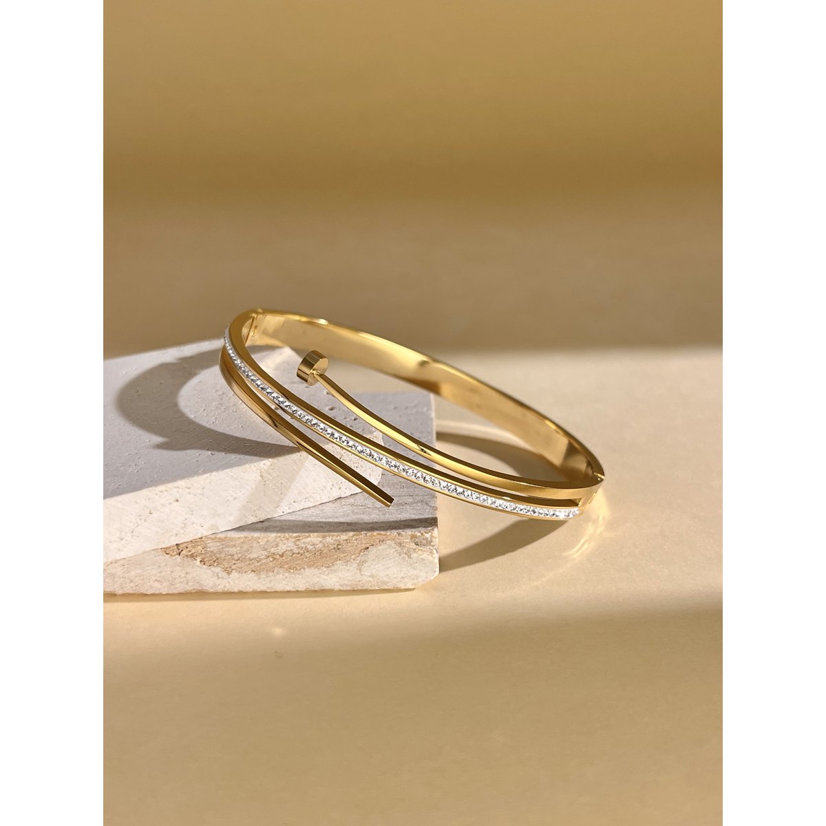Clou je narukvica koja redefinira klasiku – inspirirana industrijskim dizajnom čavla, ali izrađena u zlatnom nehrđajućem čeliku i ukrašena svjetlucavim strass kamenčićima koji hvataju svjetlo u svakom pokretu. Ovaj komad odiše samopouzdanjem i stilom.