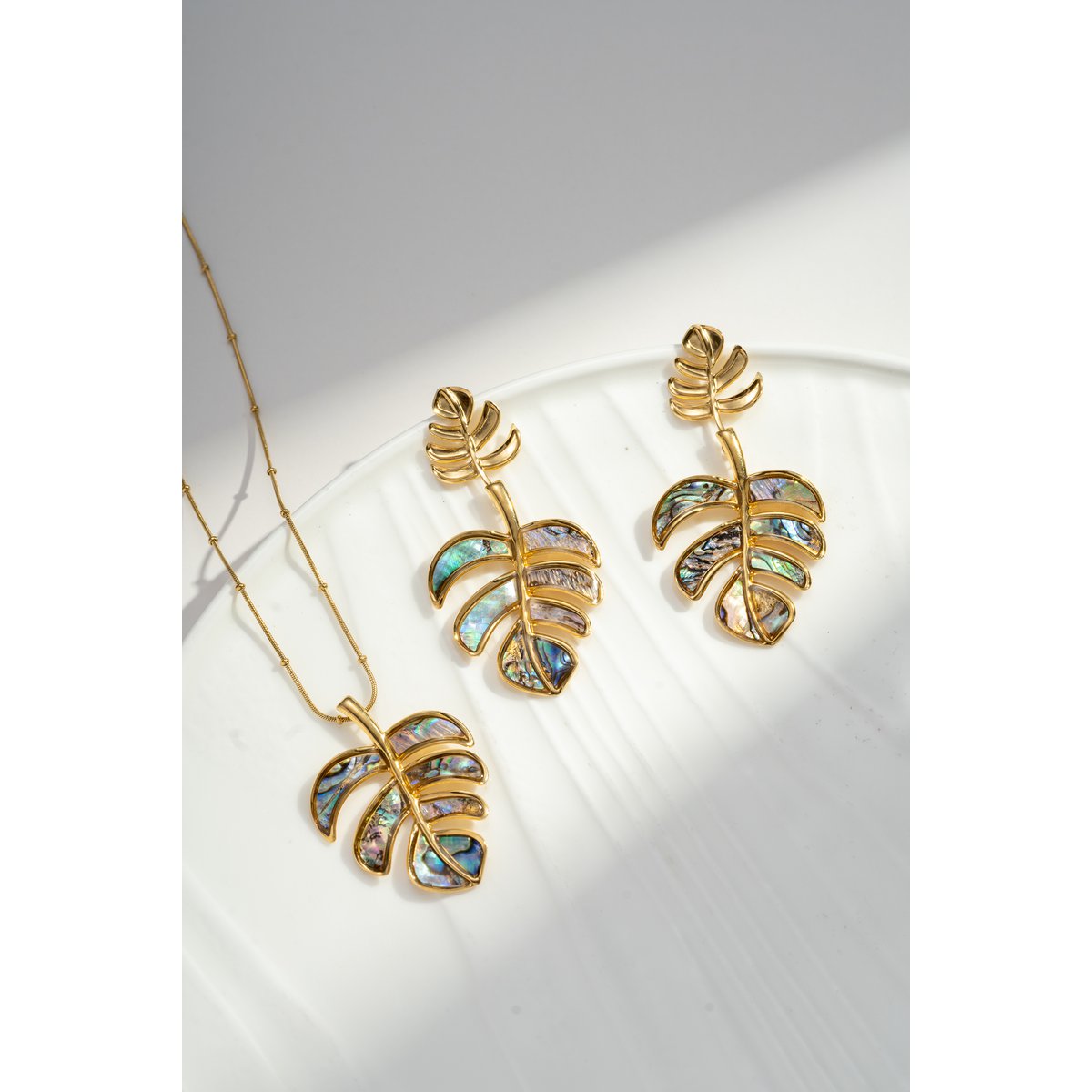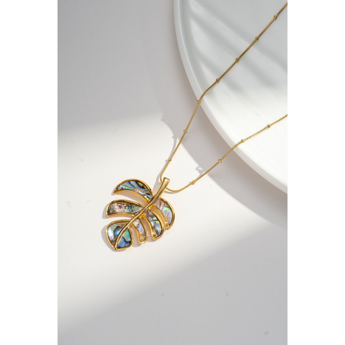 Ova ogrlica s tropskim listom u zlatnoj boji i prirodnim abalone detaljem savršeno hvata sunce – baš kao ti.