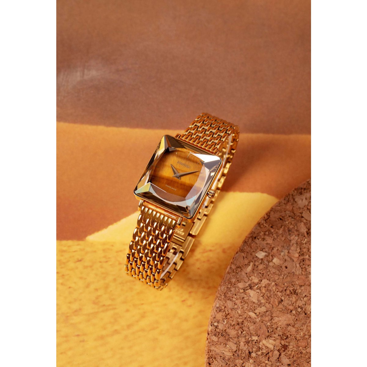 Kao da nosiš dragocjeni komad nakita – Facet Princess J8.776.M izrađen je s brojčanikom od pravog tigrovog oka, prirodnog kamena poznatog po svojim zlatno-smeđim odsjajima i simbolici samopouzdanja. Sat dolazi u prepoznatljivom kvadratnom kućištu s princess-cut staklom koje reflektira svjetlost iz svakog kuta, a zlatna čelična narukvica zaokružuje luksuzni dojam.