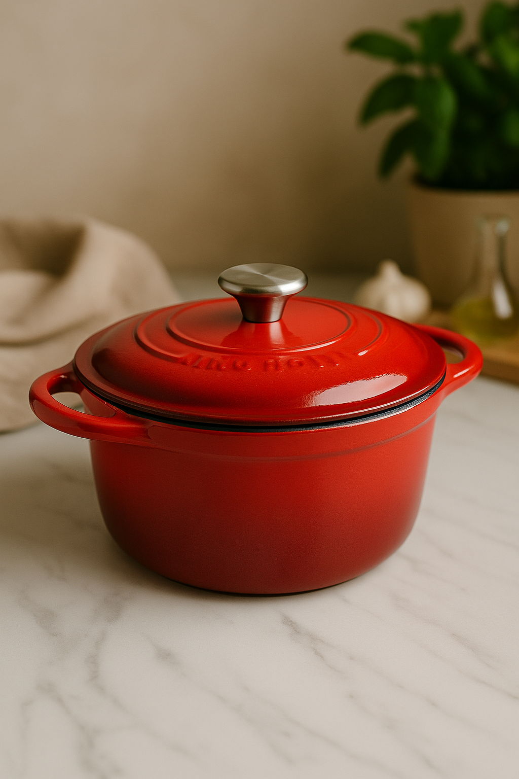 Crveni gusani lonac od emajliranog lijevanog željeza savršen je spoj estetike i funkcionalnosti. Njegova bogata boja i zaobljeni oblik čine ga neodoljivim na štednjaku, ali i direktno na stolu.