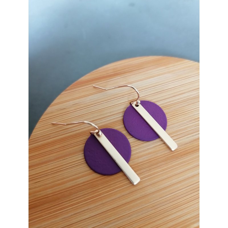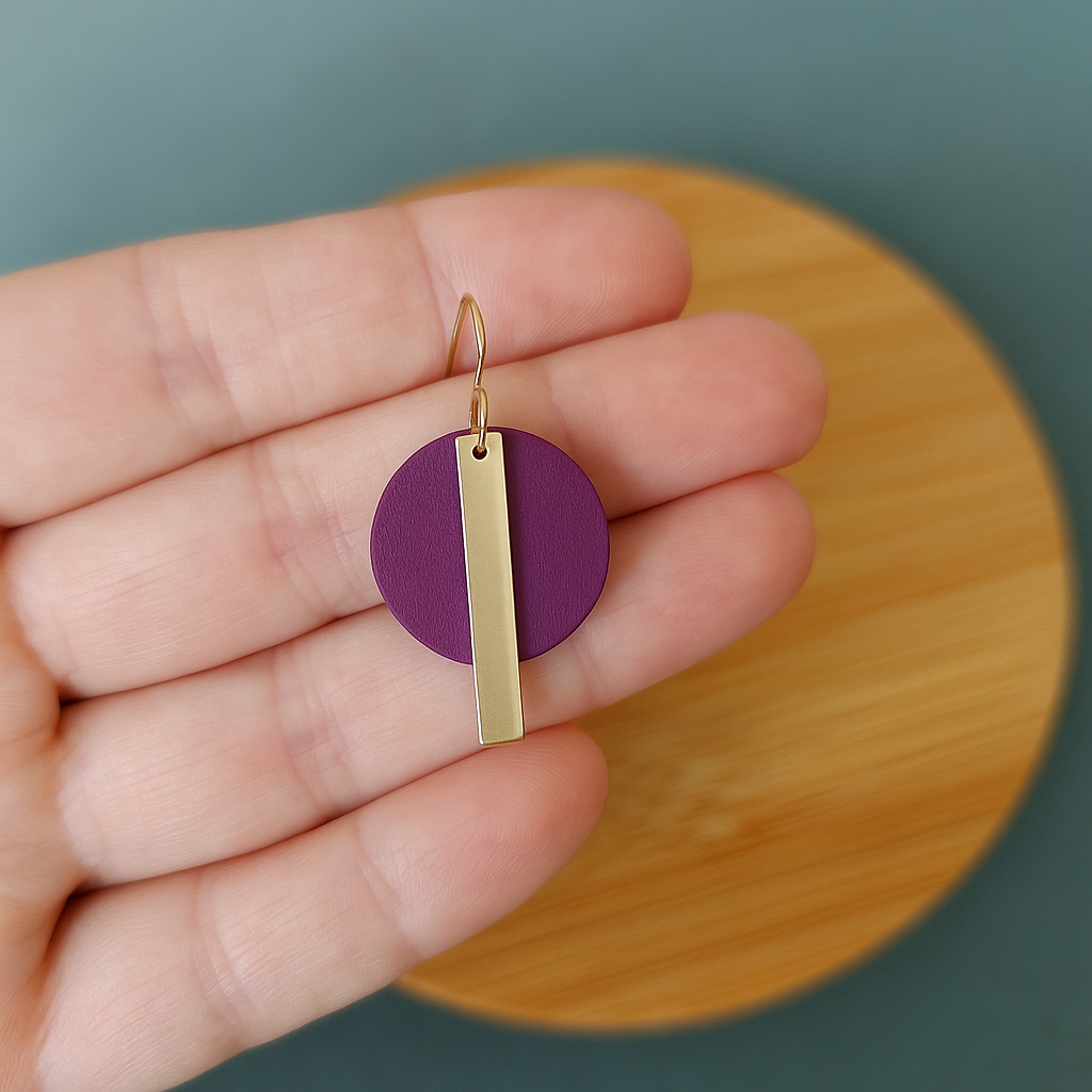 zlatne naušnice, ljubičaste naušnice, minimalistički nakit, statement naušnice, poklon za ženu, handmade naušnice, drvene naušnice, ručno rađeni nakit, ZAYA nakit, nakit iz Belgije, indie nakit brend, chic naušnice, elegantan nakit, slow fashion, poklon curi, Oona naušnice
