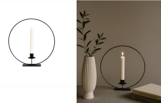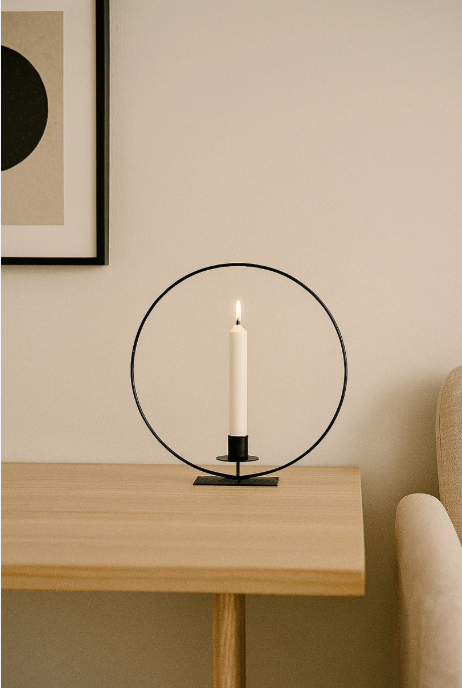 Ovaj svijećnjak u obliku prstena, izrađen od mat crnog metala, unosi dozu minimalizma, ravnoteže i suvremenog mira u tvoj prostor. Promjer mu je 30 cm, što ga čini savršenim središnjim detaljem – na stolu, polici ili u kutku koji čeka da zasja.