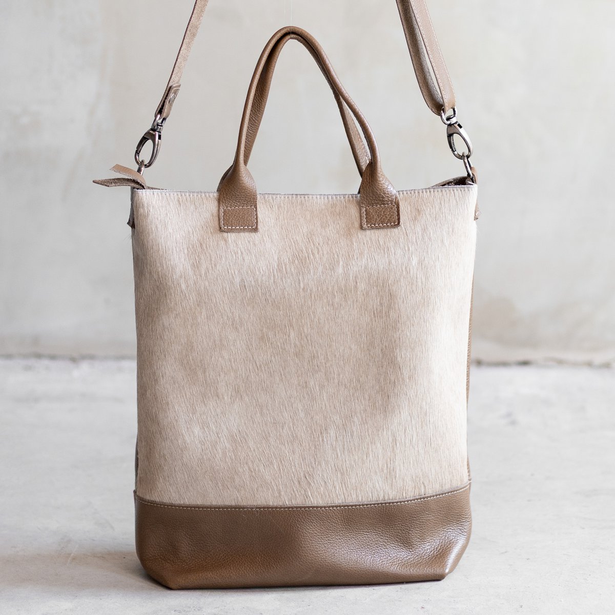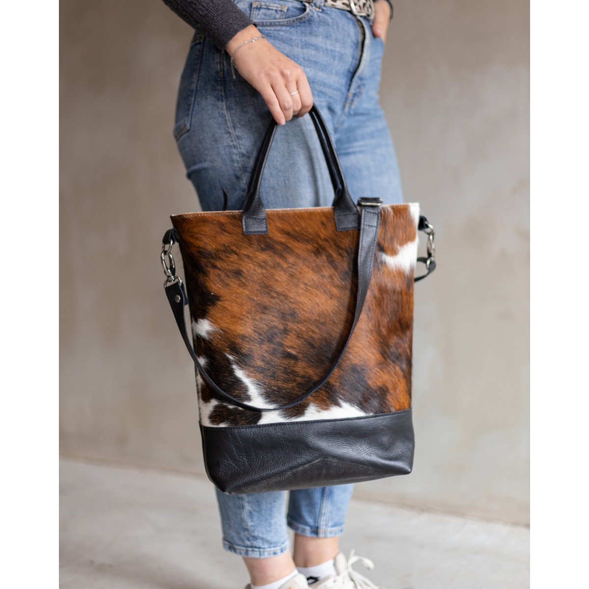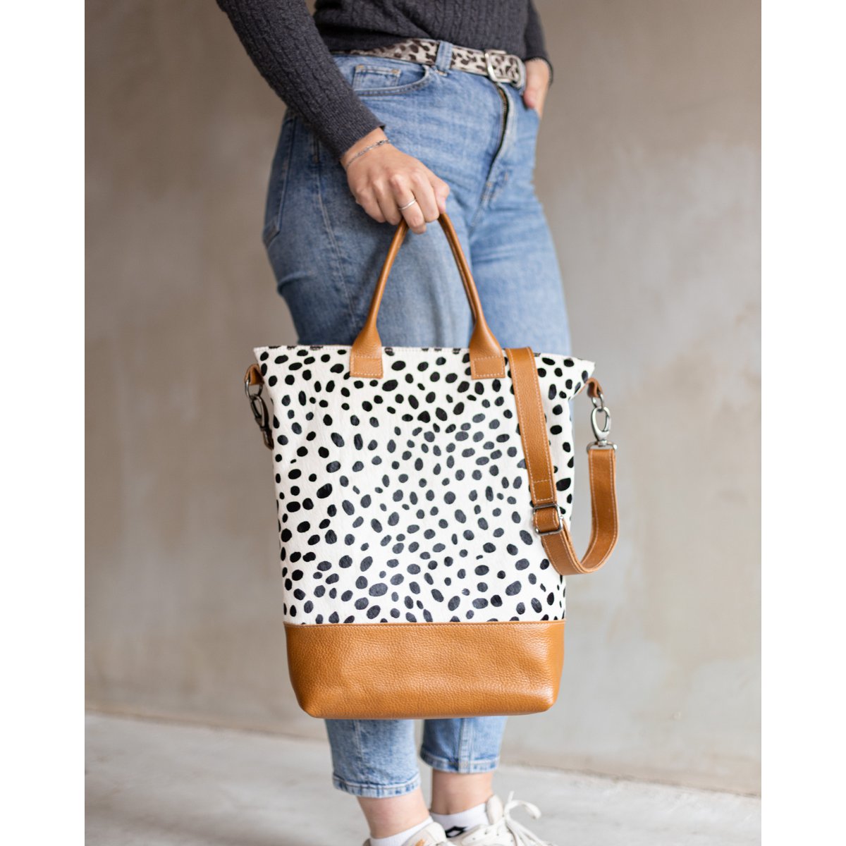 Bag Jolie je luksuzna i praktična shopper torba koja spaja elegantan dizajn s prirodnim materijalima. Ručno izrađena u Nizozemskoj od visokokvalitetne zrnate kože i prirodne kravlje kože s printom, ova torba je idealna za svaki dan – od posla do gradske šetnje.