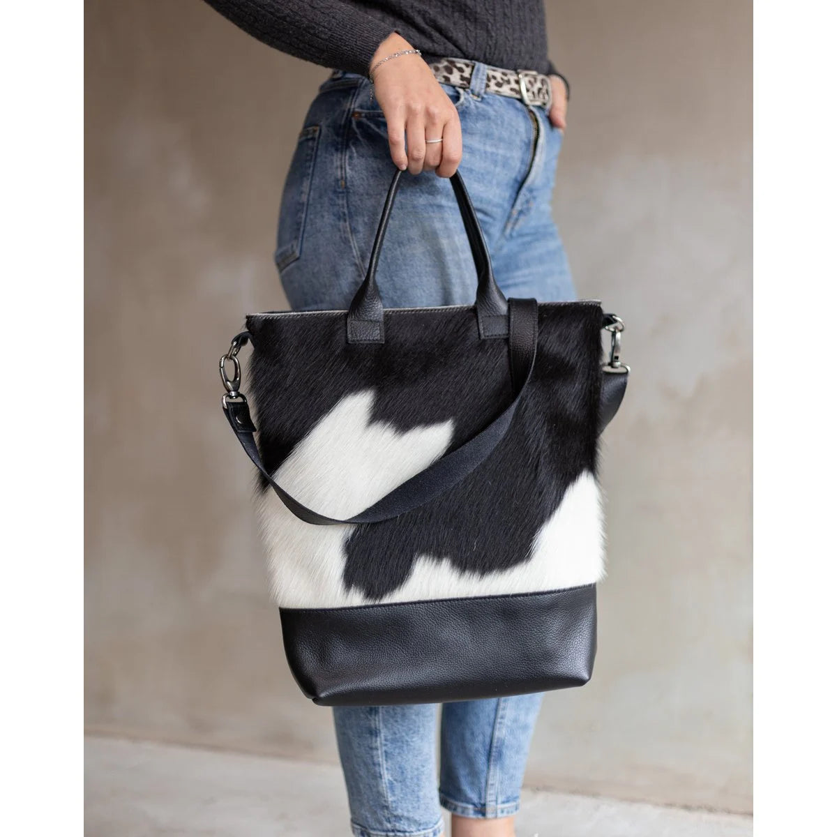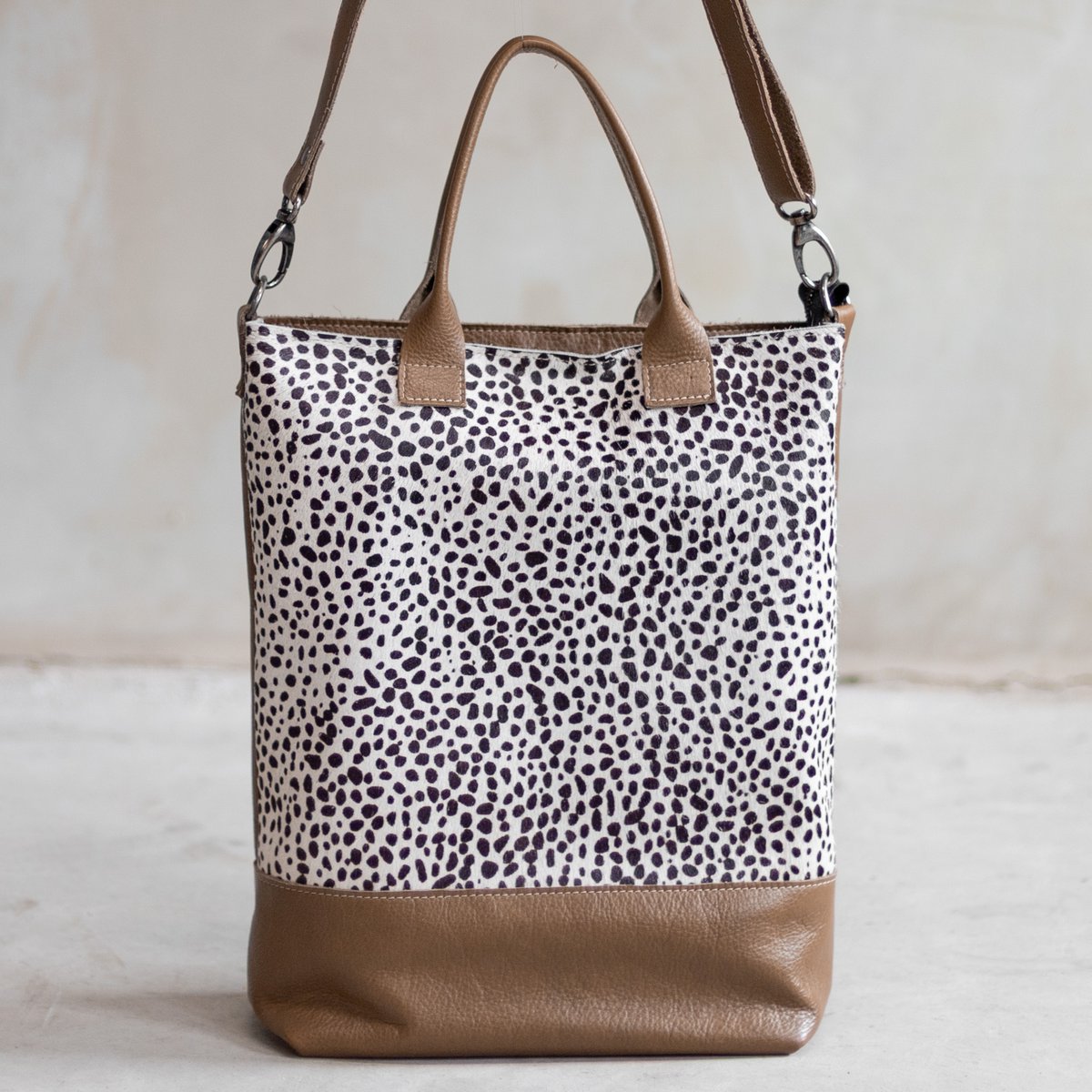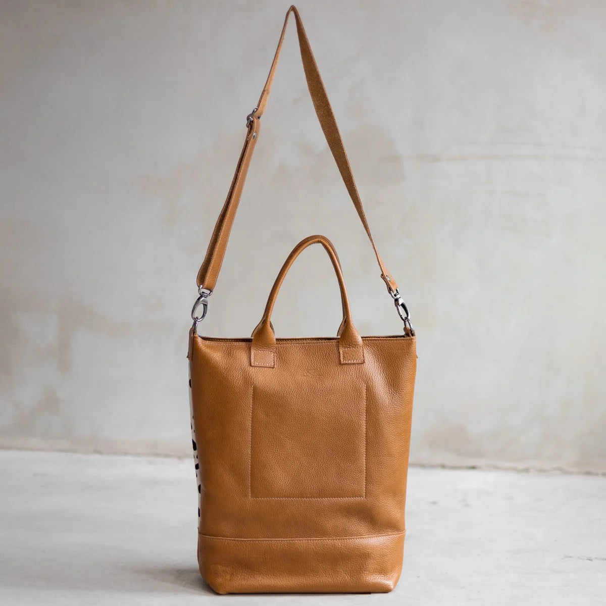 Bag Jolie je luksuzna i praktična shopper torba koja spaja elegantan dizajn s prirodnim materijalima. Ručno izrađena u Nizozemskoj od visokokvalitetne zrnate kože i prirodne kravlje kože s printom, ova torba je idealna za svaki dan – od posla do gradske šetnje.