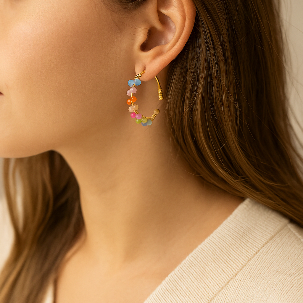 zlatne naušnice, pastelne naušnice, stainless steel earrings, naušnice s perlicama, TikTok nakit, ZAYA earrings, trendi naušnice, statement earrings, poklon curi, poklon učiteljici, dar za mamu, dar za najbolju frendicu, rođendanski poklon za nju, modni nakit Hrvatska, influencer style earrings, everyday jewelry, playful earrings, gold hoops with beads
